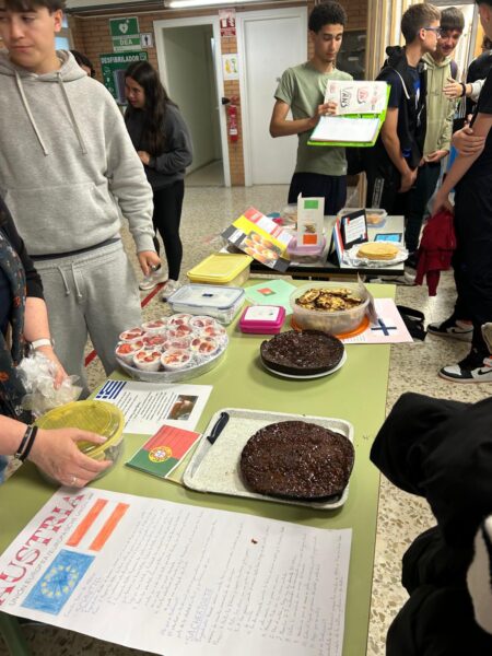 El día grande, el 9 de mayo, bajo la sombra de todas las banderas europeas, los profesores y alumnos de la asignatura (tanto de 3º como de 4ª ESO) celebraron un aperitivo multicultural en donde no faltaron un montón de platos de las distintas culturas que convivimos en la UE.
