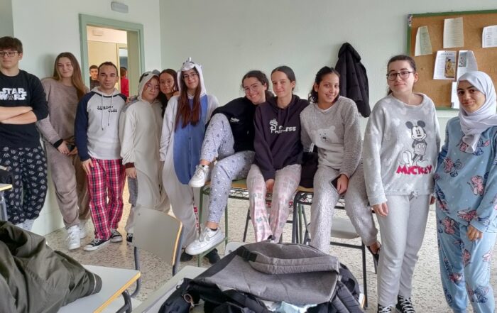 Como cada semana de carnaval, rodeados de tortillas, los alumnos de bachillerato vinieron bien abrigados con sus pijamas. Tampoco quiso perderse la fiesta el ya habitual dinosaurio.