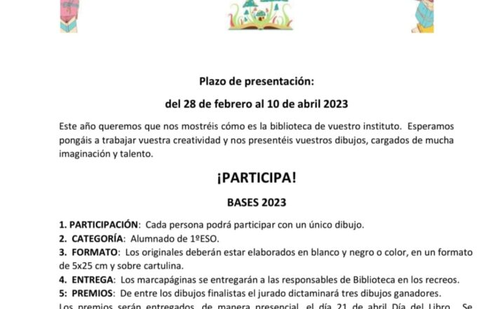 Un año más, con motivo de la celebración del Día del Libro, se convoca el concurso de marcapáginas dirigido al alumnado de 1°ESO. ¡Anímate y participa! Habrá premios ...