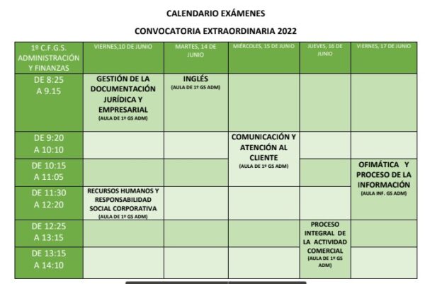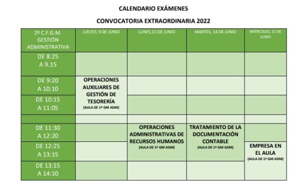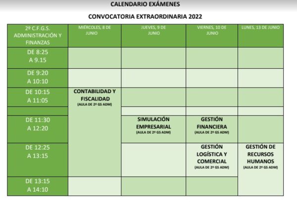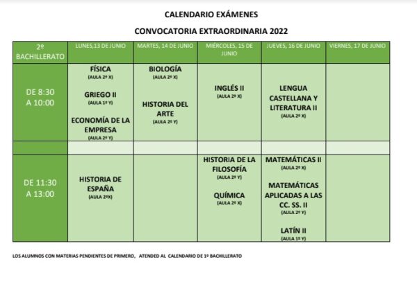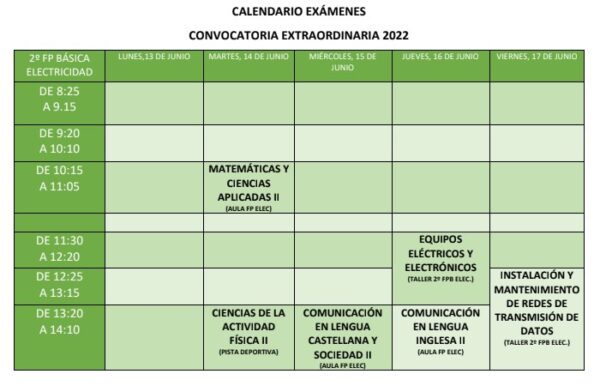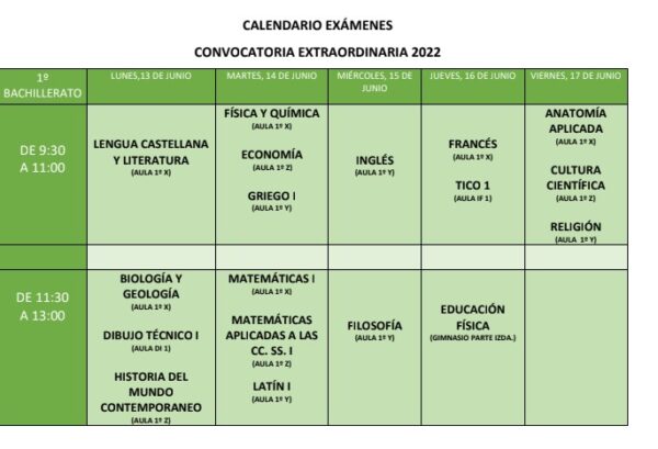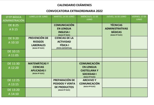 Calendario de exámenes Bachillerato, FPB y Ciclos. Convocatoria Extraordinaria 2022