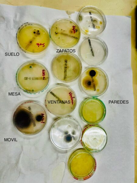 Para ello han hecho primero un cultivo en placas Petri y después de tener las manos limpias han tocado diferentes superficies, entre ellas su propio móvil. Como se puede observar en la imagen el crecimiento de microorganismos es muy grande en la placa del móvil.