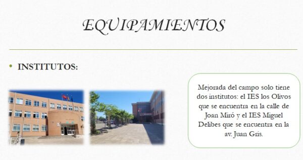Durante las últimas semanas del curso los alumnos de 2º A y D han realizado un proyecto por grupos estudiando los distintos barrios de Mejorada del Campo (Casco antiguo, Los Olivos, nuevas zonas residenciales, las parcelas y el polígono industrial).