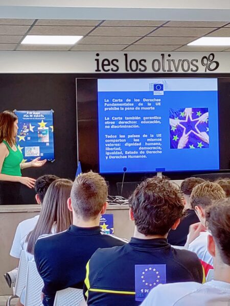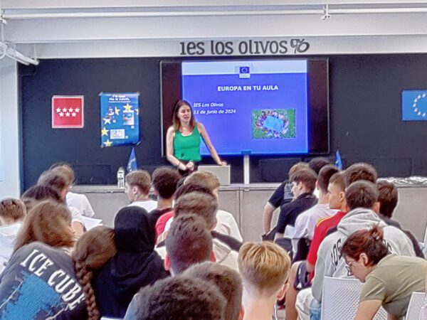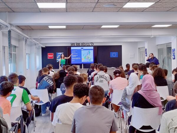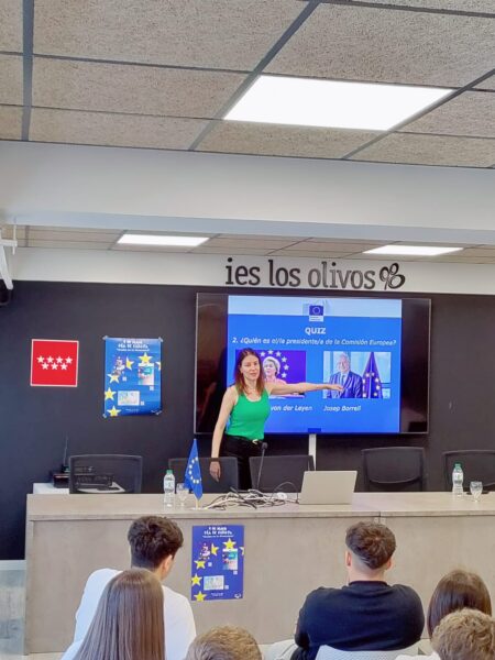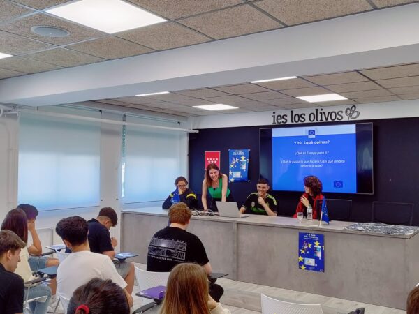 El Aula Magna se llenó hasta los topes de alumnos de 4º y 3º ESO que jugaron a un QUIZ sobre la Unión Europea que nos permitió conocerla mejor en sus principales representantes, programas (como el Erasmus, el voluntariado europeo, Interrail…) o inversiones (como los famosos Next Generation)