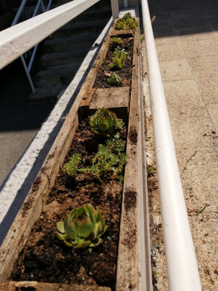 En la entrada del Instituto, los alumnos de la asignatura de Huerto Escolar están empezando a realizar pequeños huertos de plantas crasas (aquellas que acumulan agua en sus hojas, siendo muy resistentes a la sequía y la falta de riego), reutilizando estructuras de madera.