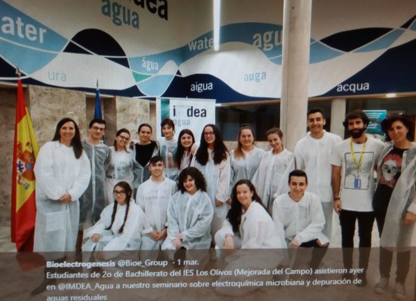 Seminario sobre electroquímica microbiana Vicente Camarasa2019-03-15T20:30:22+01:0015 marzo 2019|Etiquetas: Bachillerato, Ciencias| El 28 de febrero, nuestros alumnos de 2º de Bachillerato de Ciencias acudieron a un seminario sobre electroquímica microbiana y depuración de aguas residuales impartido por el departamento de Biotechnology for a sustainable development de la Universidad de Alcalá-UAH Comparte esta información en tu red social favorita FacebookTwitterLinkedInWhatsappGoogle+PinterestEmail Artículos relacionados