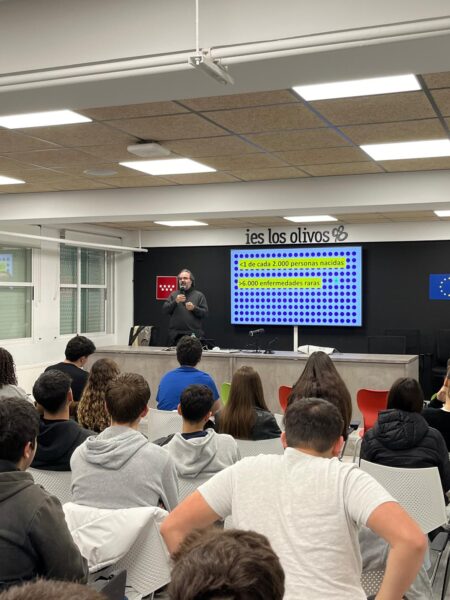 Ayer nos acompañó Lluís Montoliu, investigador del CNB ( centro nacional de biotecnología), del CSIC y del Centro de Investigación Biomédica en Red de Enfermedades Raras, y nos dio una conferencia, dirigida a los estudiantes de biología de 4 de la ESO, 1 y 2 de bachillerato, sobre estas enfermedades raras.