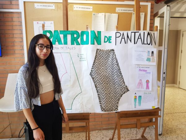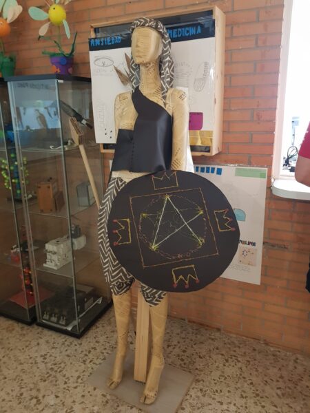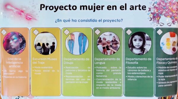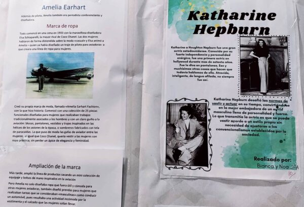En ellas encontramos a las mujeres pioneras a la hora de diseñar o vestir pantalones (que estudiaron en lengua) , la medición de las constantes elásticas de diferentes tejidos, su estudio del poder blanqueante de la lejía y la síntesis de pigmentos para una camiseta (Física y Química), el diseño de un patrón de pantalón y el producto final de un maniquí vestido con ropa diseñada a su medida, imitando la vestimenta de una antigua guerrera amazona (plástica) o una reflexión (en la que los demás también podemos participar) sobre los cánones de belleza y los estereotipos, tratando el tema que relaciona moda y derechos de la infancia (valores).