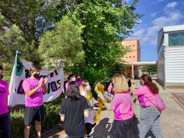 Todo comenzó con ambos equipos bien diferenciados por las camisetas que nos ha donado el ayuntamiento . Alumnos amarillos contra profesores fucsias; unos desfilando con su pancarta, otros escuchando la charla motivacional de Jaime.